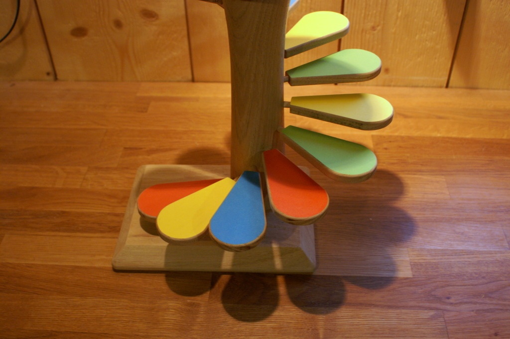Bravo pour cette originale et délicate réalisation ! J'imagine que la construction n'est pas aussi simple que l'on pourrait peut-être le supposer...par exemple, pour obtenir un perçage régulier des trous qui supportent les marches tout autour de la tige ? Au moyen d'une défonceuse montée sur le tour à bois ?...ou une perceuse à colonne avec un support en V ?...