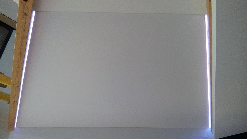 J'ai commencé par réaliser un plancher dans un des quartier de la maison (la maison est octogonale). Solivage entre les porteuses, plancher en OSB et parquet stratifié au dessus. En dessous comme nous ne voulions pas voir le solivage, aller vite dans les travaux sans trop salir (et donc ne pas poser du placo), nous avons posé une toile tendue au plafond de la mezzanine. J'en ai profité pour placer également 2 rails Led le long des porteuses.
