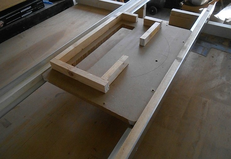 Je n'ai pas de scie sous table. Je n'en ai jamais trop éprouvé le besoin, mes scies à ruban me suffisent. Je me suis quand même fabriqué une scie sur table, un bâti qui permet d'y poser une vieille scie circulaire. La scie est fixée sur une plaque qui coulisse entre deux rails. Cela me permet de découper des panneaux, bien droit, et bien d'équerre, avec une bonne précision.