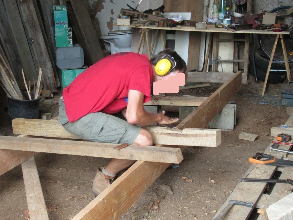 Et puis on ne s'en est rendu compte qu'au moment de la découpe des poutres poussiéreuses ! La contrainte était d'utiliser le bois déjà présent dans la grange.