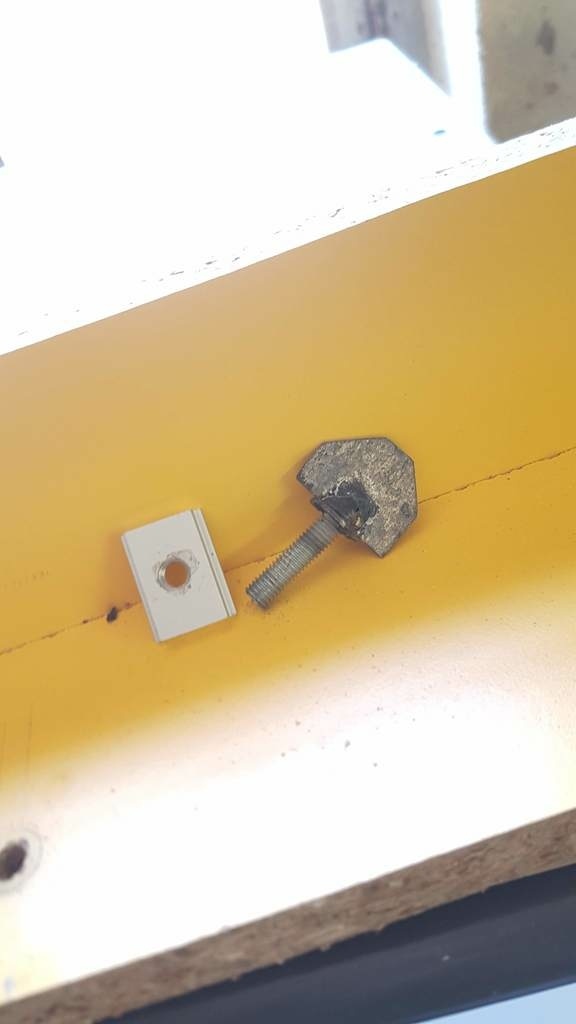 Et pour fixer mon guide sur les rails j'ai fabriquer des vis à oeillet avec de la tige filleté et de la tôle (Ce sont mes premiers points de soudure, ne me jugez pas )