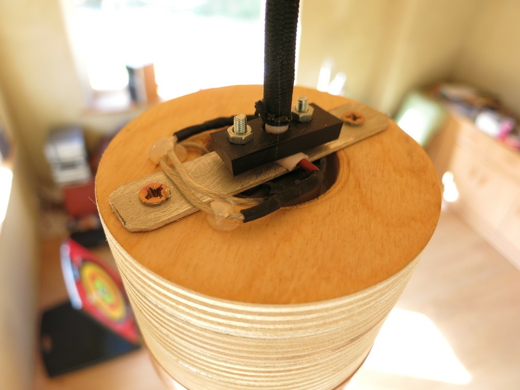 On trouve assez facilement du fil recouvert de tissu pour faire la suspente. Une petite entretoise en plastique vient serrer le câble et les deux fils sont soudés au fils du support GU10. Il faut faire quelque chose de compact et discret.