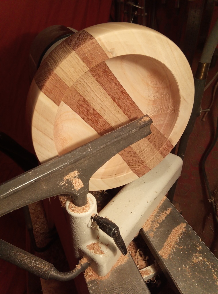 Réalisation d'une coupe à fruits avec plusieurs essences. Tournage réalisé à la gouge a profilé et gouge a creusé.