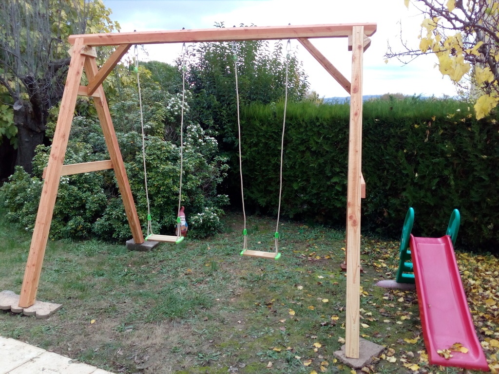 Portique simple 2 balançoires en Douglas de la scierie MBR Mélèze Bois Rond à Mallefougasse dans les Alpes de Haute Provence. Reste l'ancrage à réaliser.