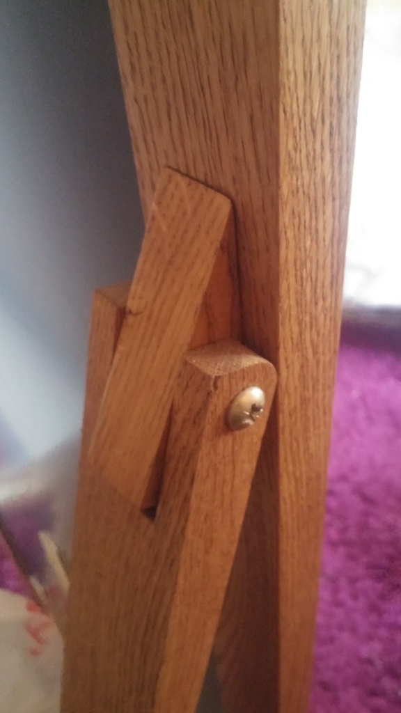Donc voici un miroir sur pied en chêne. Les assemblages sont réalisés par tenon mortaise, à l’exception des 2 pièces de bois qui font charnière avec la partie pied arrière, qui sont collées à plat joint.