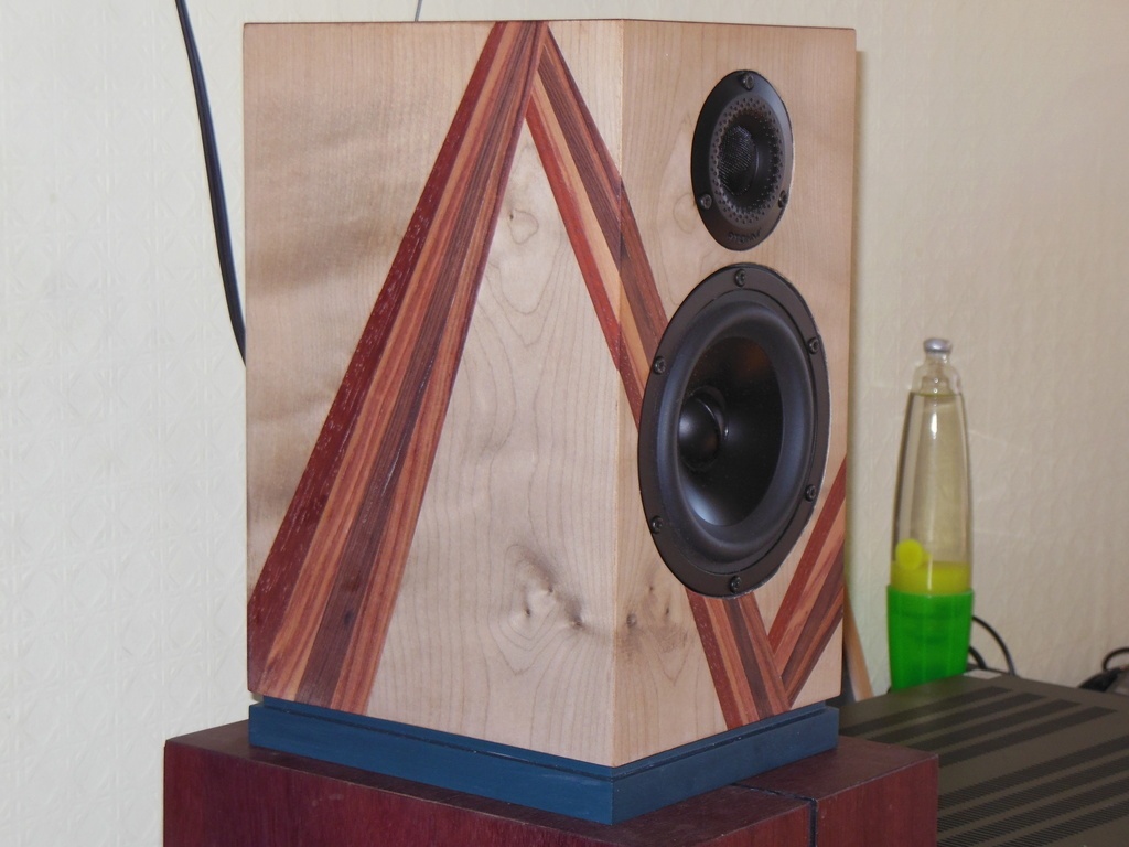 je vous présente mes deux enceinte constituant un 2.1 (2 enceinte plus le caisson de basse) le caisson de basse est en cours de fabrication, le caisson est en médium plaqué avec différentes essences indiquées plus haut;