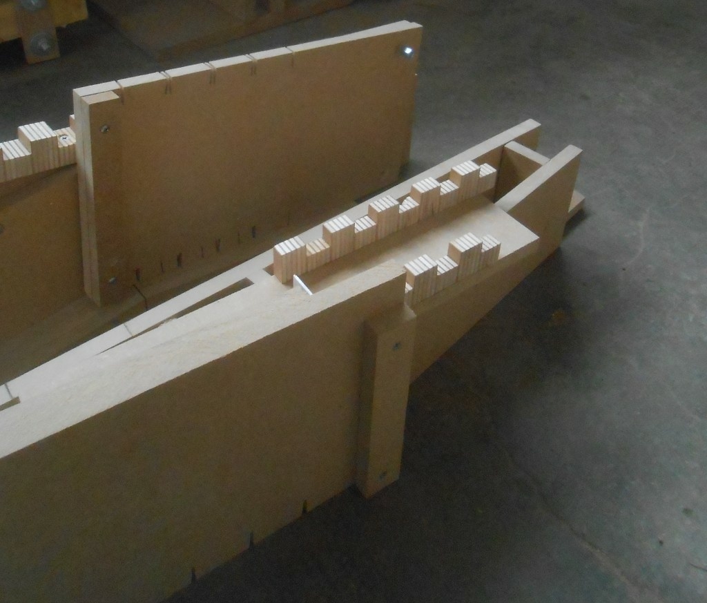 Pour faire des queues d'arondes avec des traits de coupe en biais, le tout est monté sur des plans inclinés.