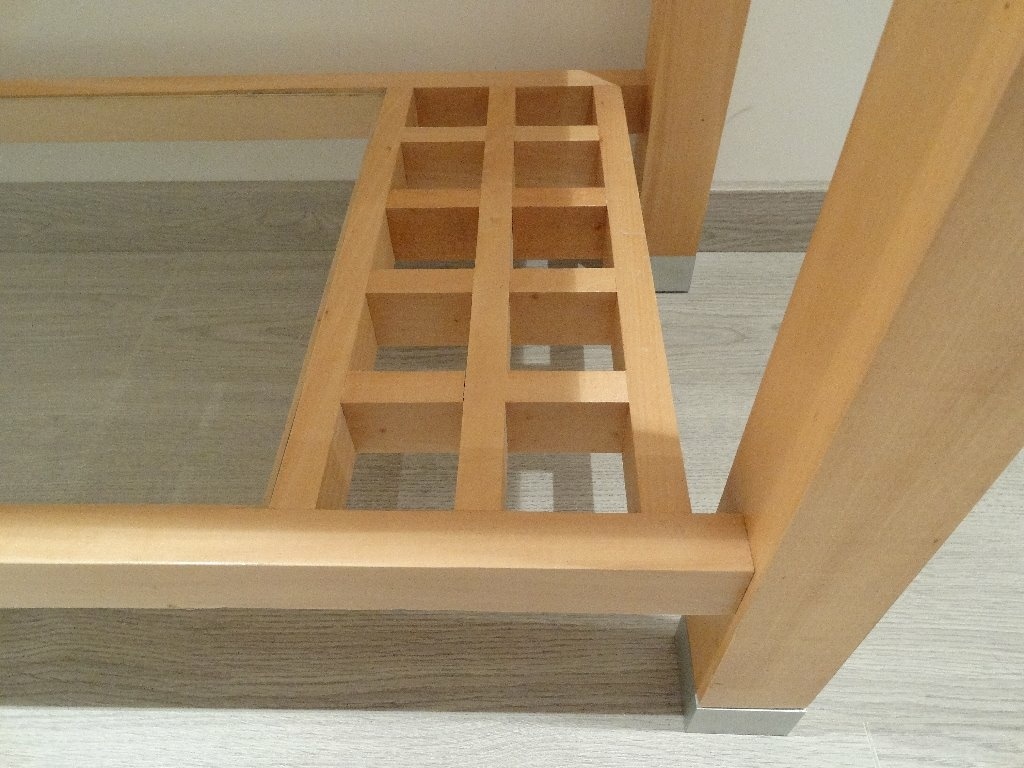 Dessus en plaquage chêne-érable, Partie inférieure quadrillée, avec assemblage à mi-bois et au milieu une tablette en verre.