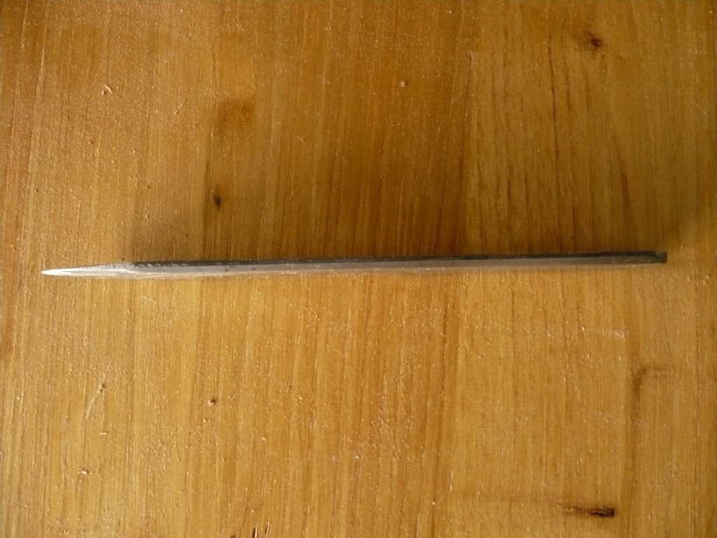 Quand il m'a appris à tracer le bois,Henri m'avait recommandé de me séparer du tranchet que je venais d'acheter.(Ce que je n'ai pas fait et je crois qu'il n'en a pas été dupe.) Il m'en a taillé un dans un fer de dégau . Là aussi la lame est taillée en ellipse et polie.