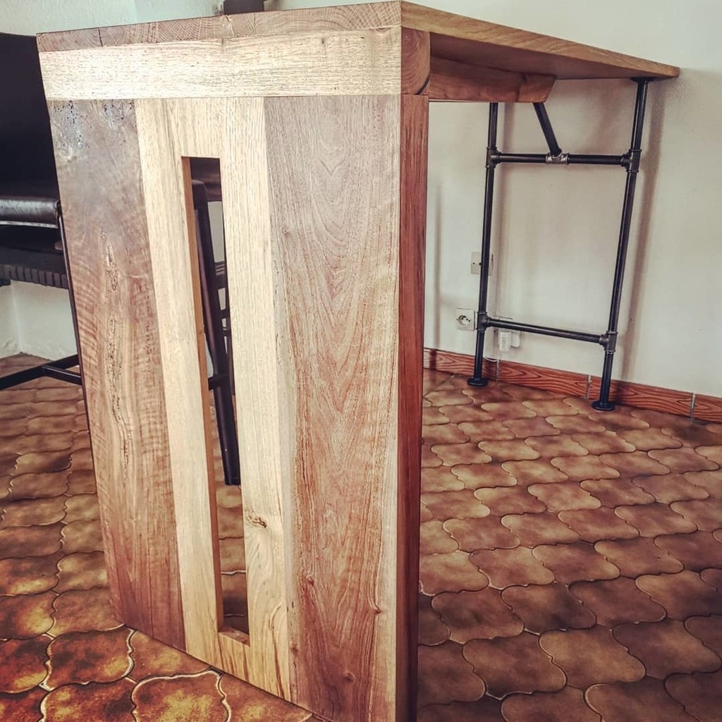 J'ai réalisé cette table Bar style indus avec un plateau en Chêne et un pied en Noyer avec insert en Chêne.