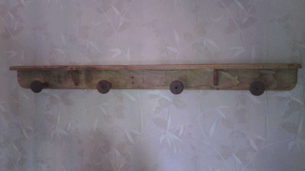 Porte manteaux mural réalisé avec deux planches de palettes pour les fond, la tablette et les deux équerres et quelques chutes d'iroko pour les portes manteaux.