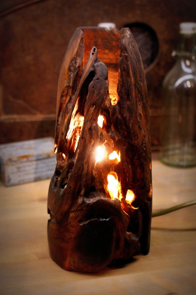 Lampe tourné et sculptée dans une loupe (due au gui) sur une branche de noyer noir.