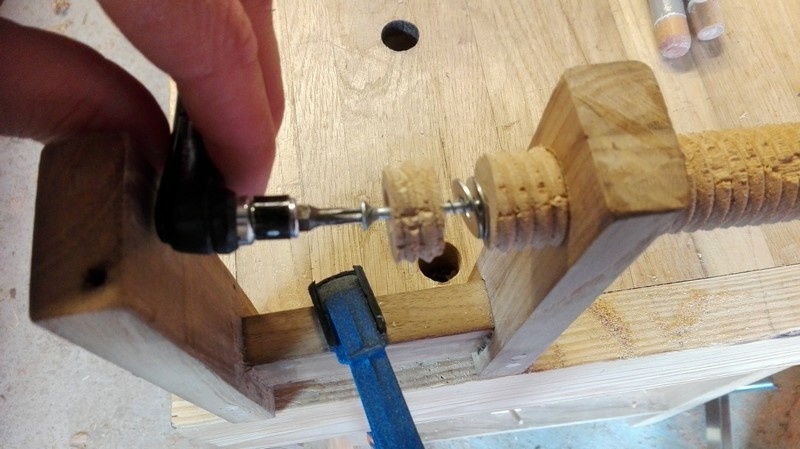 Le côté serre joint en métal me gênait, j'ai voulu m'en faire en bois mais çà ne serre pas bien et un a cassé (la force exercée était trop près du bois de bout, en plus le teck visiblement n'est pas génial de ce coté là!)
