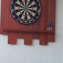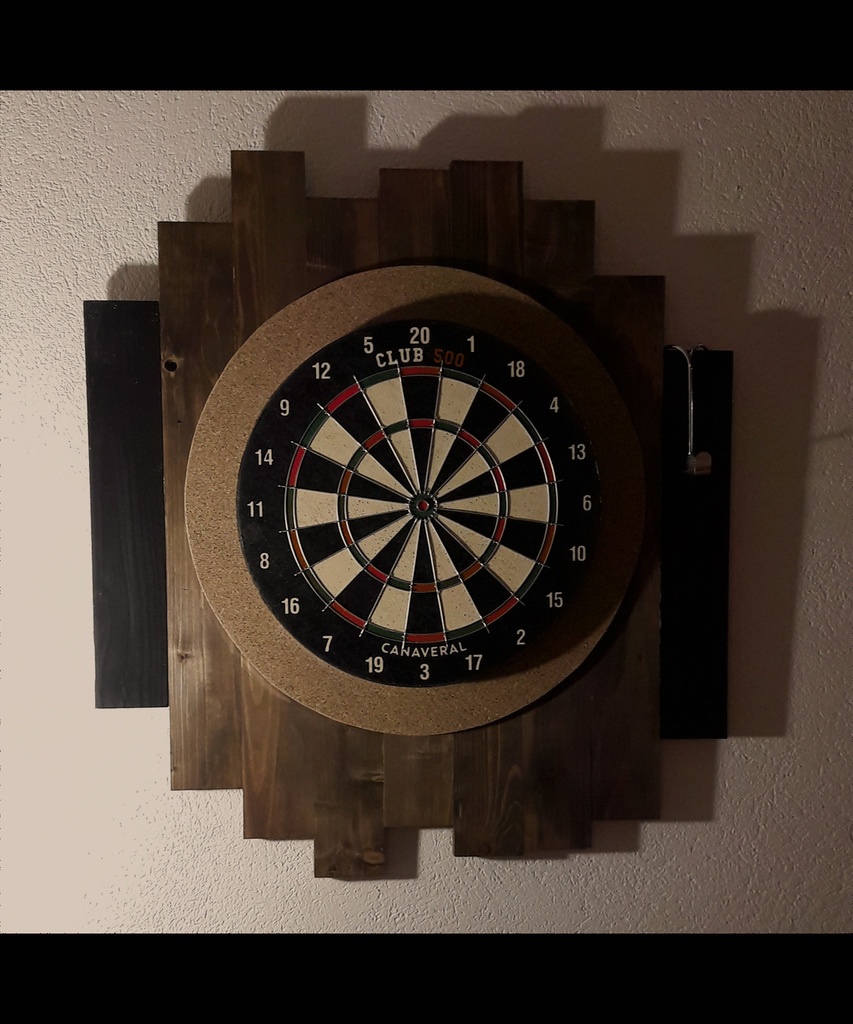 Voici un jeu de fléchettes mural que j'ai eu l'occasion d'offrir à une amie qui aménageait son salon en salle de jeu (billard, fléchettes, palets, ...). En recherchant un peu sur le web, j'ai fini par me décider sur ce design "rustique" me permettant d'écluser un stock de bois de palette qui me dérangeait dans l'atelier. L'avantage de ce montage est de s'adapter à la matière première. La longueur des lattes est aléatoire selon la palette ou l'état du bois et minimise donc les découpes, calculs, ajustements, ... La matière première impose le design. C'est pratique quand on a pas beaucoup de temps et qu'on ne veut pas multiplier les chutes.
