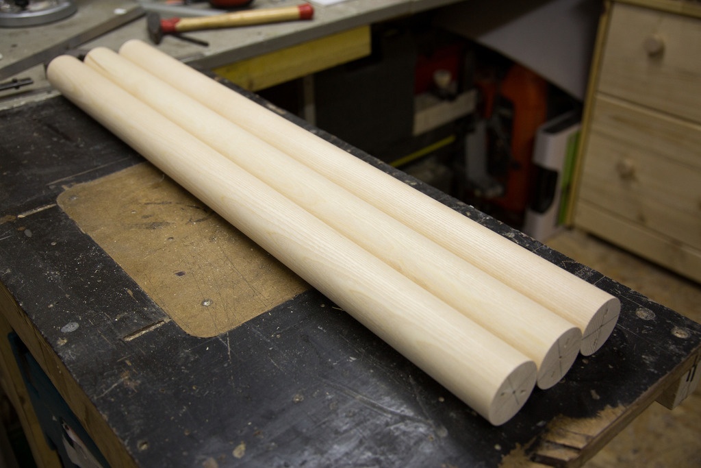 J'ai ensuite débité les quilles, coupe à 45° à la scie sous table, longueur max 150 mm, et par conséquent longueur min 95 mm.