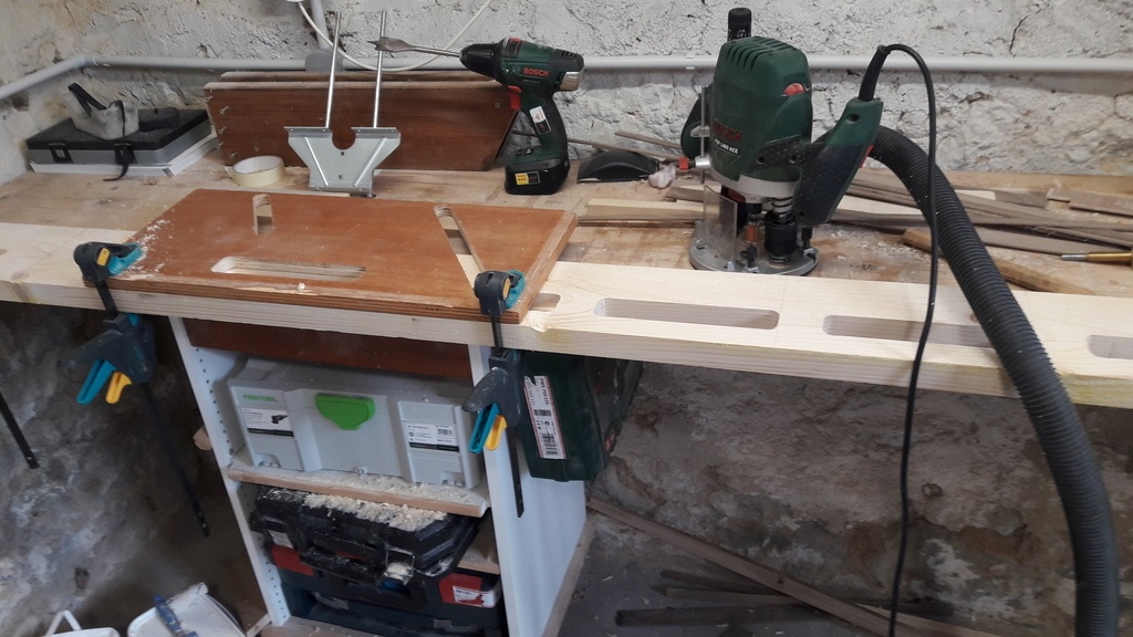 Au final, vu la pente et le poids, trop compliqué de la faire escamotable donc je l'ai déplacée contre le mur. L'inconvénient, c'est que les enfants ont moins de place pour leur établi.