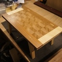 il me restait du bois de bout alors j'ai fais un plateau avec un motif différend de ma petite table. L'entourage est assemblé par queue d'aronde et le fond est recouvert d'un placage inconnu (une chute trouvée dans l'atelier de mon école).