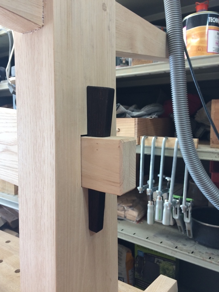 Le plateau est assemblé par tenons/mortaises classique collés et chevillés.