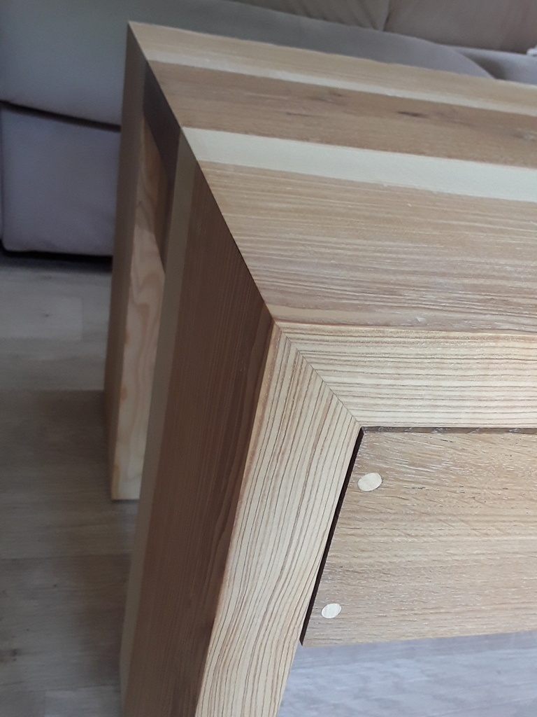 Merci pour ce commentaire. Cela dit, la façade étant plus large que le tiroir en lui même, les queues d'aronde semblent impossibles. J'ai donc préféré faire une rainure à la defonceuse au dos de la face pour y insérer les côtés du tiroir. Les chevilles ou tourillons sont sur les tiroirs plus esthétiques.