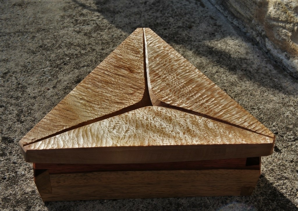Voici donc la boîte en triangle, assemblée à queue d'aronde. Je me suis amusé à texturer le couvercle en platane à la gouge. Le résultat me fait penser à un chapeau de pirate, à vrai dire. Finition très rapide à la gomme laque. Et il y a donc le pas à pas déjà publié, pour réaliser ce genre de queues, en plans non d'équerre.