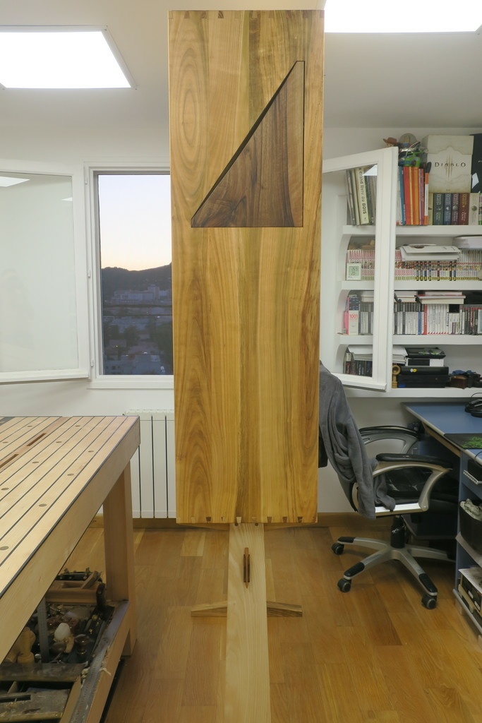 Les pieds sont rigidifiés par une traverse en noyer assemblée par tenon mortaise traversant, le tout avec un "coin" bloquant l'ensemble. Les chevilles tiennent le restant, je les ai collées en bas mais pas en haut, de ce fait le meuble peut se transporter en deux sections distinctes en se détachant.