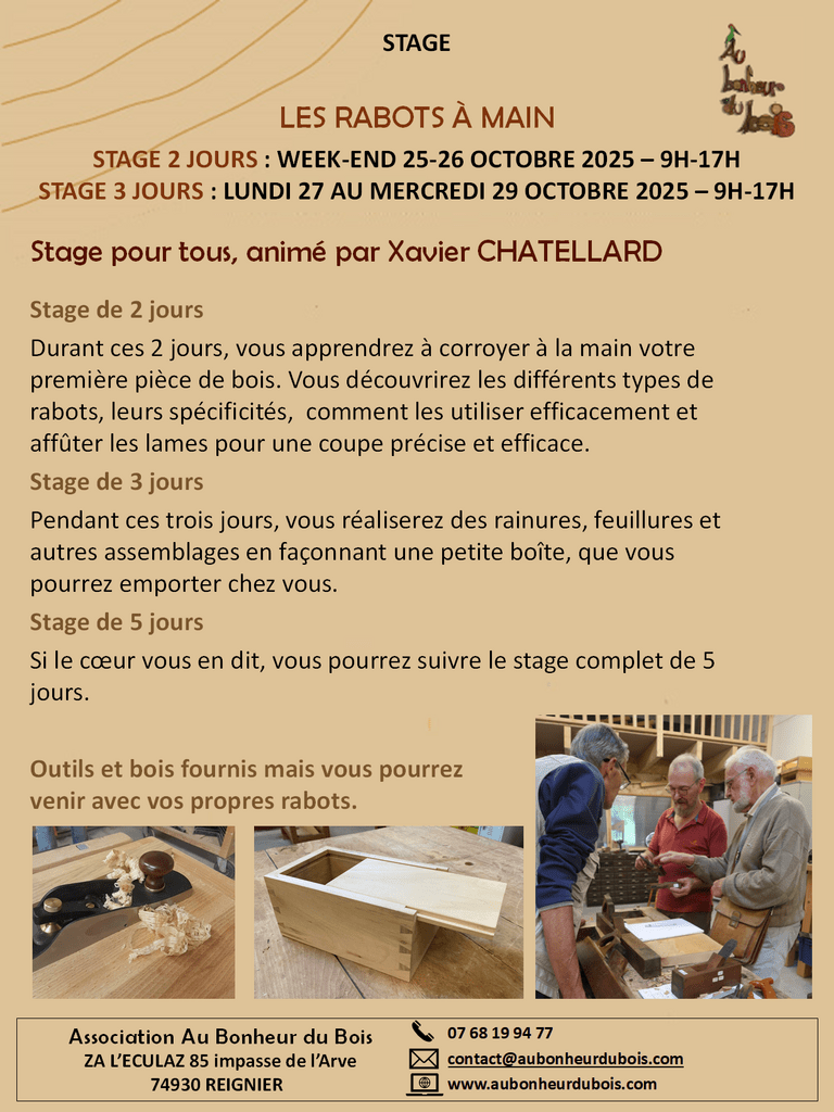 L'association "Au Bonheur Du Bois" vous propose un stage "Rabots à main" animé par Xavier Chatellard.
