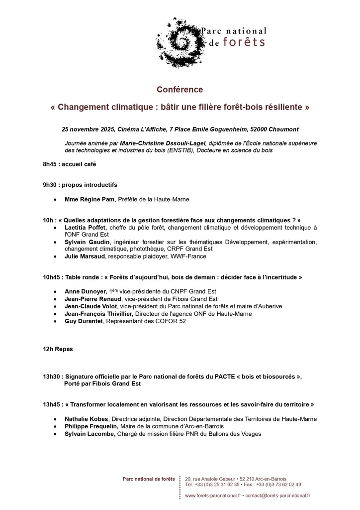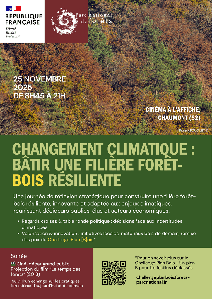 Le changement climatique impacte nos forêts et suscite de nombreuses questions : À quoi ressembleront les forêts de demain ? Comment les entreprises de la filière bois seront impactées ? Sont-elles prêtes ? Comment peuvent-elles s’adapter ? Ces questions sont au cœur des réflexions de la journée organisée par le Parc national de forêts et animée par Marie-Christine Dssouli-Lagel, diplômée de l’Ecole nationale supérieure des technologies et industrie du bois (ENSTIB) et Docteure en sciences du bois, le mardi 25 novembre 2025, au Cinéma « À L’Affiche » de Chaumont (Haute-Marne).