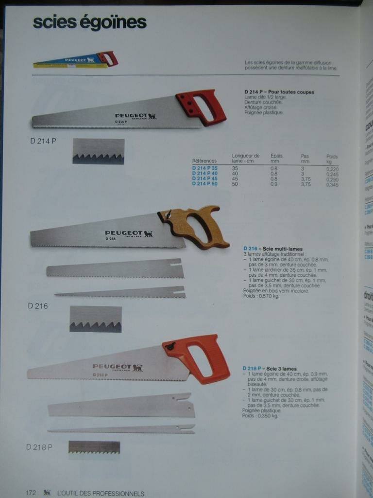 Voici les pages du catalogue Peugeot Frères de 1981. On y retrouve la scie égoïne à dos aminci déjà présente dans le catalogue des années 1950.