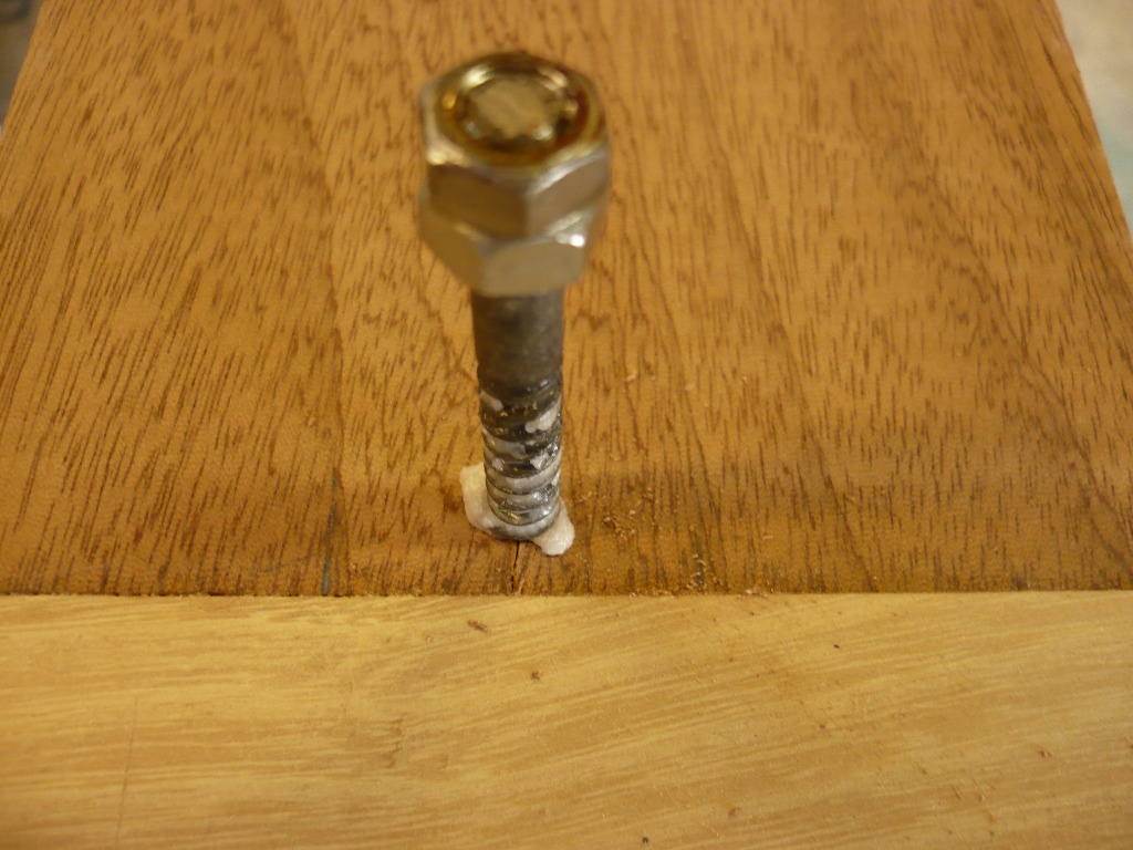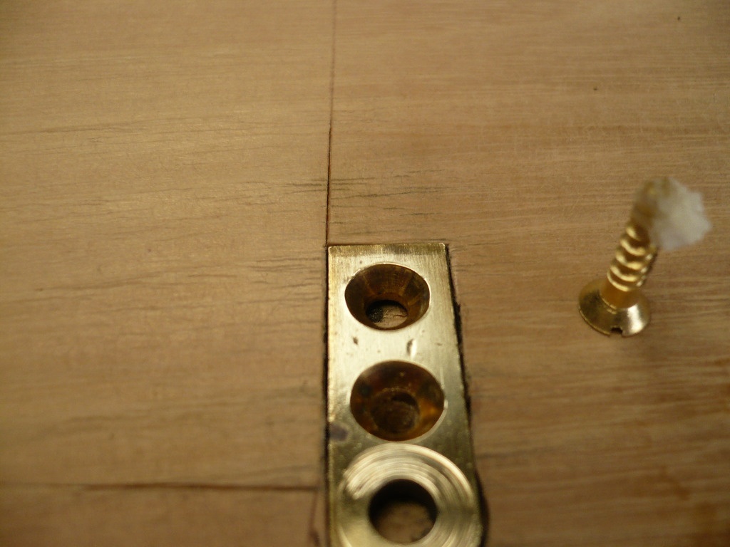 Avant la mise en place des vis laiton tête fraisées 3.5*15 avec le tournevis automatique (Hérité du Père de mon Épouse qui lui même le tenait d'un soldat Américain qui lui en avait fait cadeau avant de rentrer chez lui après la guerre) [lairdubois.fr/...vis-automatique j'ai fait un avant trou à la pointe carrée, ce qui présente deux avantages: