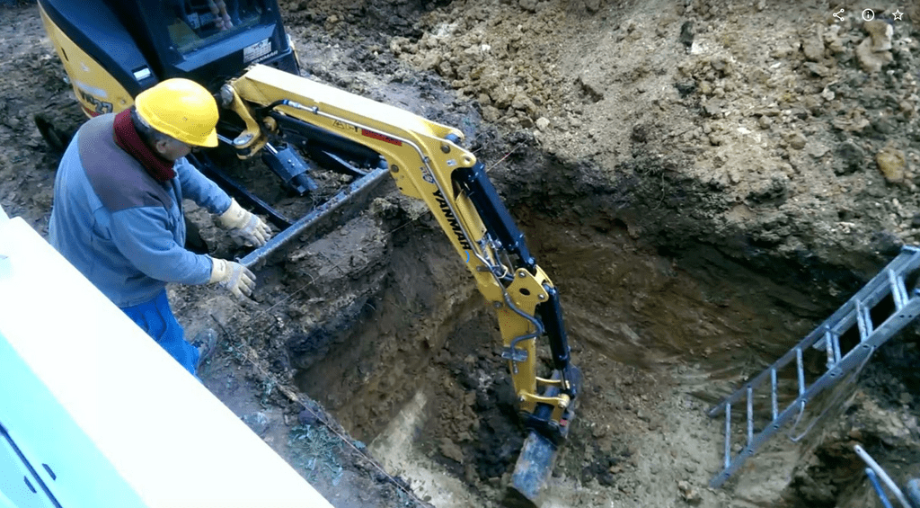 Le debut des travaux date du 24 novembre 2021. et on a commencé par creuser un petit trou de 2m de profondeur histoire de profiter des travaux pour enterrer une cuve de récupération des eaux de pluie.