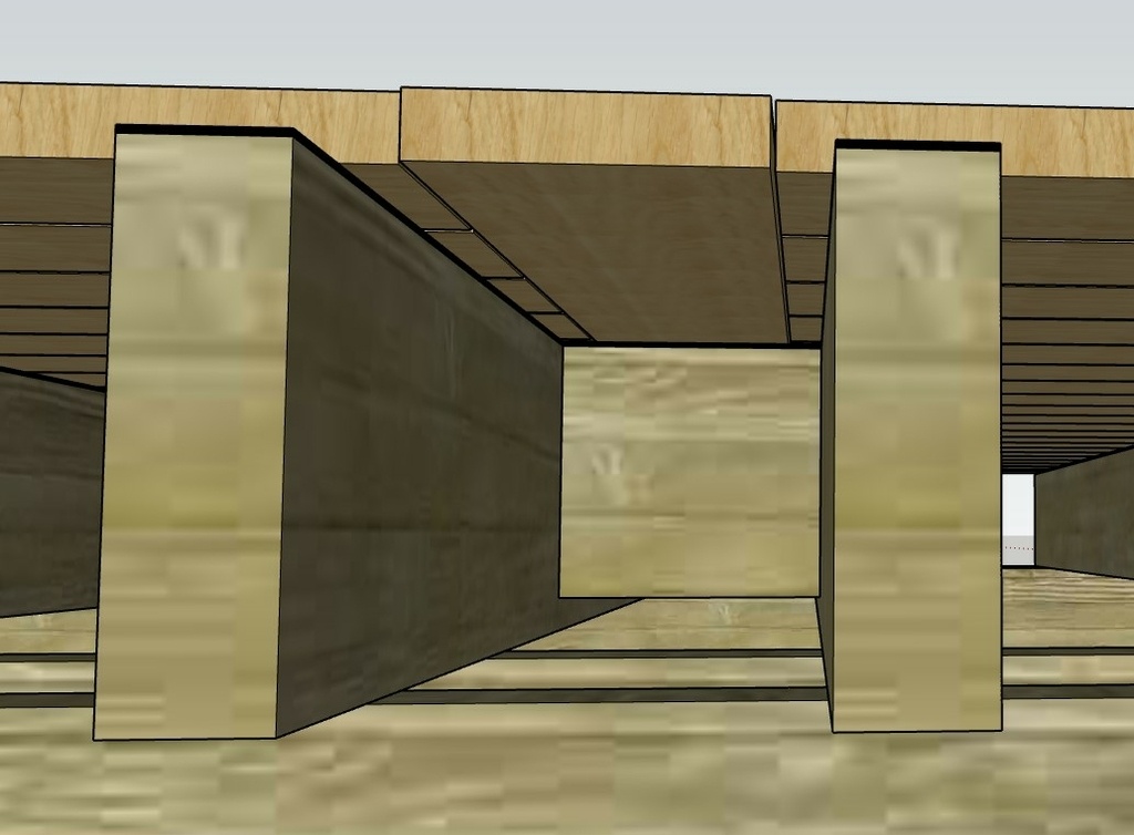 Suite à ma question, et aux réponses que vous m'avez donné (encore merci), j'ai affiné la conception de la structure : d'une part pour être en accord avec le platelage (voir ci-dessous) et d'autre part pour réduire aux maximum le risque de rétention d'eau, et donc de pourrissement.
