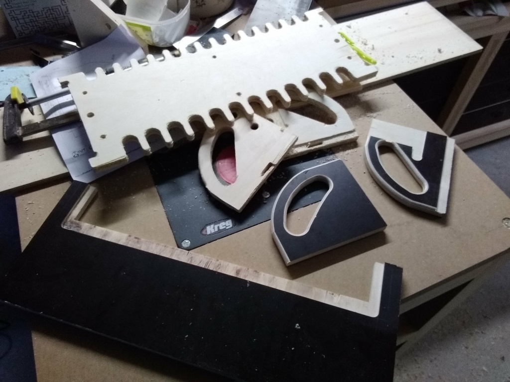 Comme expliqué dans le "plan", je me suis inspiré de la solution LEIGH RTJ400 principalement, tout en analysant les solutions de différents boiseux ou de solutions du marché. Bref, je voulais une solution utilisant une défonceuse sous table avec bague de copiage... enfin c'est ce qu'on verra