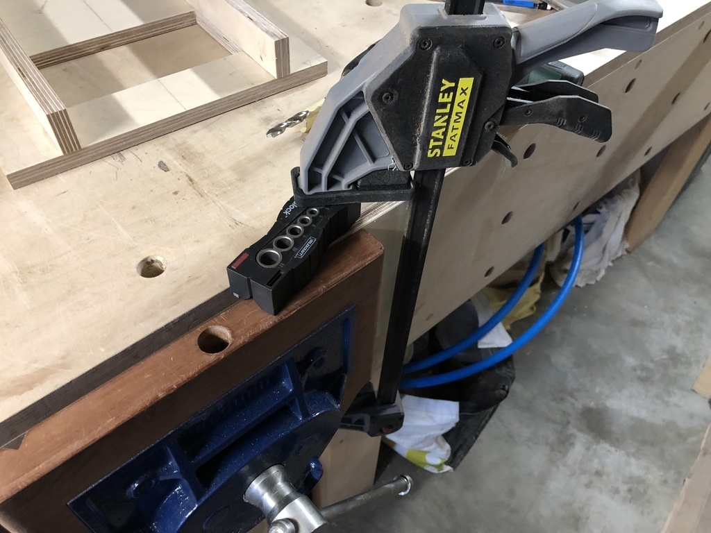 Même en fixant le guide, le perçage sur le travers du contreplaqué avec un foret à bois, c'est pas ça avec un foret à bois. Les deux couteaux sur la périphérie du foret butent à chaque passage entre couche du contreplaqué, et comme la pointe du foret ne le stabilise pas bien, puisqu'on est en bois de bout, le foret tremble et le guide bouge.