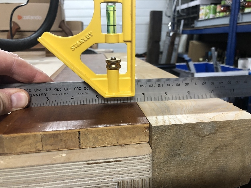 Profitant du tablier perpendiculaire de mon établi, j'ai poussé jusqu'à équarrir avec cette méthode, en tournant la pièce à usiner d'un quart de tour, la face fraichement usinée venant s'appuyer sur le tablier, avec un résultat honorable là aussi.
