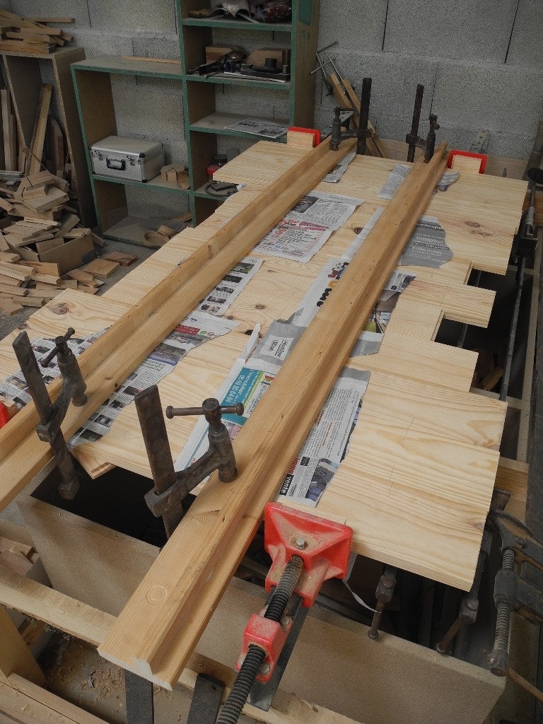 Je commence par faire sauter les rainures et languettes des lames à la format. Ensuite je coupe les lames à la radiale pour avoir les longueurs dont j'ai besoin. J'assemble les panneaux avec des lamellos, je colle, je serre, je recoupe à la format et hop c'est fait!