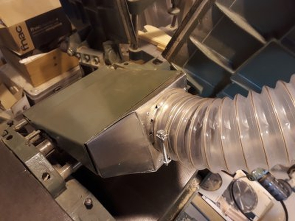 Là encore il se trouve que par un hasard extraordinaire, la lumière de sortie de sciure fait exactement la même taille que le déflecteur de la raboteuse. Cela nous permet à nouveau d'utiliser l'adaptateur, mais cette fois il ne va pas tenir tout seul !