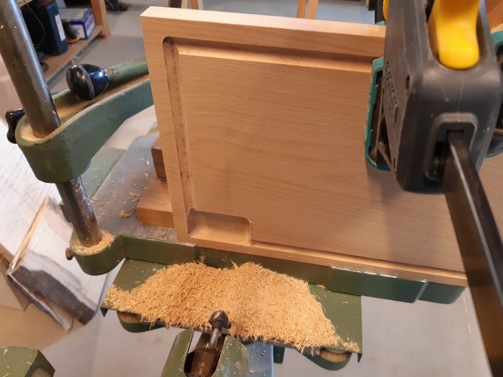 Pour les mortaisage en série, avec butée donc, j'ai opté pour une solution très simple : le presseur retient non plus la pièce à usiner mais une pièce de bois (chute) placée derrière la pièce à usiner. Deux sauterelles fixées sur la chute maintiennent cette pièce. Une petite butée est vissée sur la chute. Pour le changement de pièce, lever les sauterelles (et non la presse !) et le tour est joué. Cordialement.