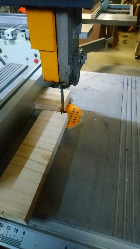 Tout d'abord je détermine la taille des cales et je les découpes dans un bois tendre en l'occurrence du pin avec ma scie a ruban pour les petites pièce 60x60 c'est l'idéale