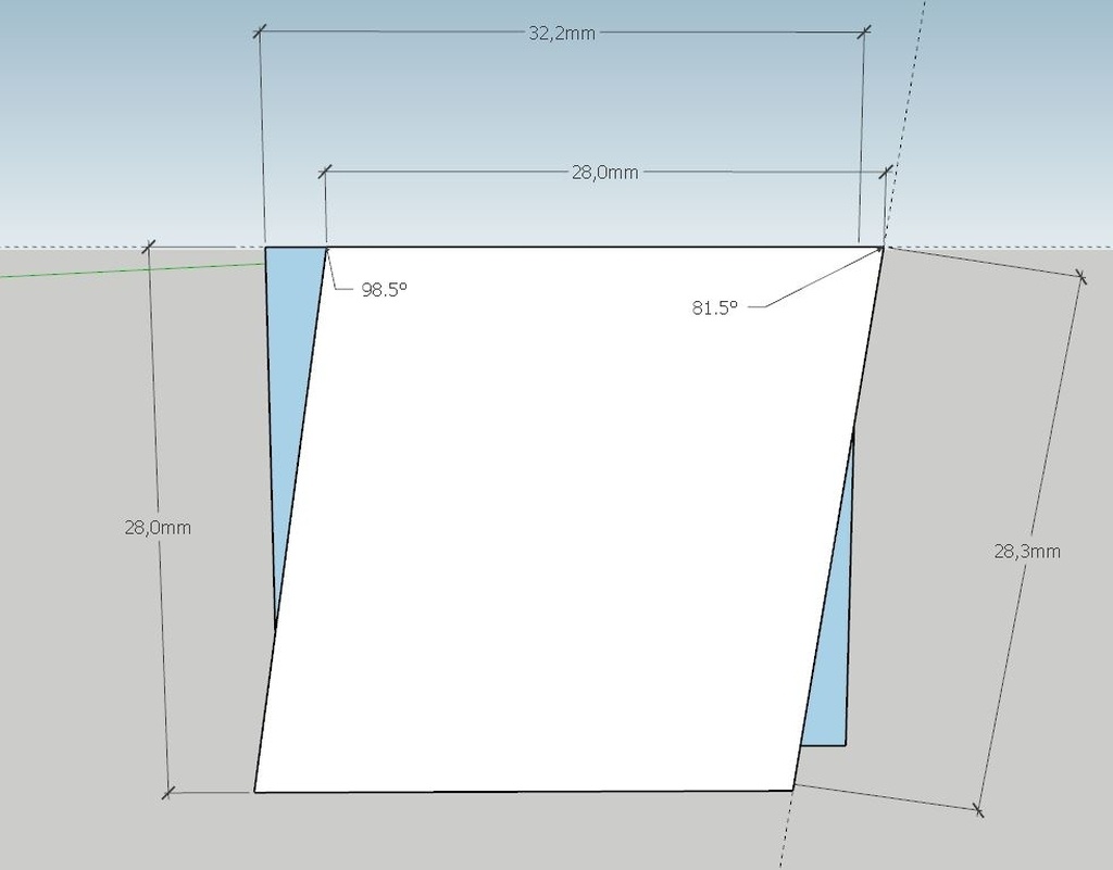 Je rappelle donc que mes pièces font 28mm de côté. Quand on a des angles droits les 4 arrêtes font 28mm, sauf qu'ici avec deux angles à 92.5° et deux à 87.5, il fallait prévoir une surcôte car j'avais besoin de 29.2 mm à dégauchir en biais.