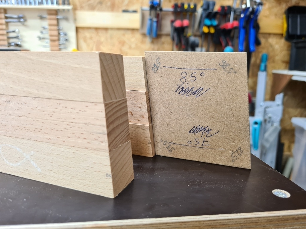 - Parallépipèdes à 2 angles 92.5° et 2 angles 87.5°* correspondant à l'angle d'inclinaison de mes pièces vers l'intérieur. Cette fausse équerre me servira à régler le guide de dégauchisseuse pour corroyer les traverses longitudinales ainsi qu'à vérifier les équerrages des pièces les unes par rapport aux autres.