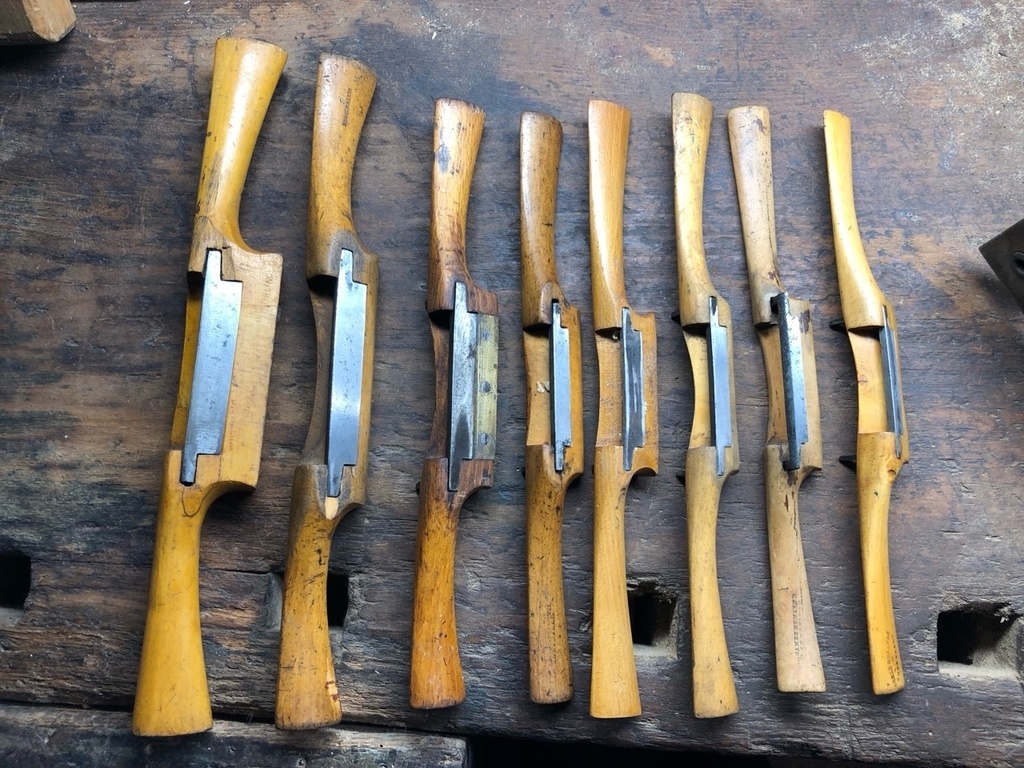 Détail intéressant, un des « Wooden spokeshave » a été réparé avec un morceau de buis, matériau souvent utilisé pour les petits vastringues de modeleur. Taille des fers 1,5 à 4 pouces pour les wastringues de Charron.