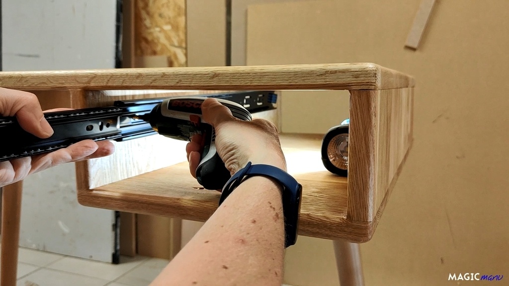 Je peux maintenant poser les tiroirs. J’ai pour cela utilisé des vis large pour meuble.