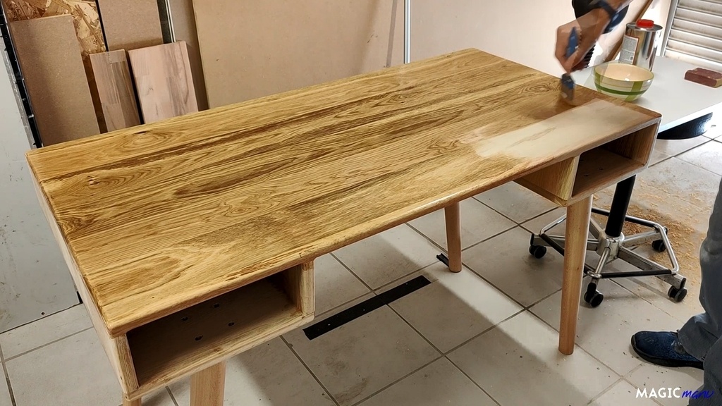 Je suis parti d’une tablette en chêne passif pleines lames de 2,5 m de long, qui m’a permis de découper toutes les parties du bureau dans une seule planche.