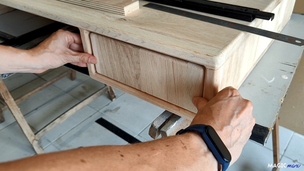 Pour les contours de tiroir, la colle est prise, je les assemble au plateau.