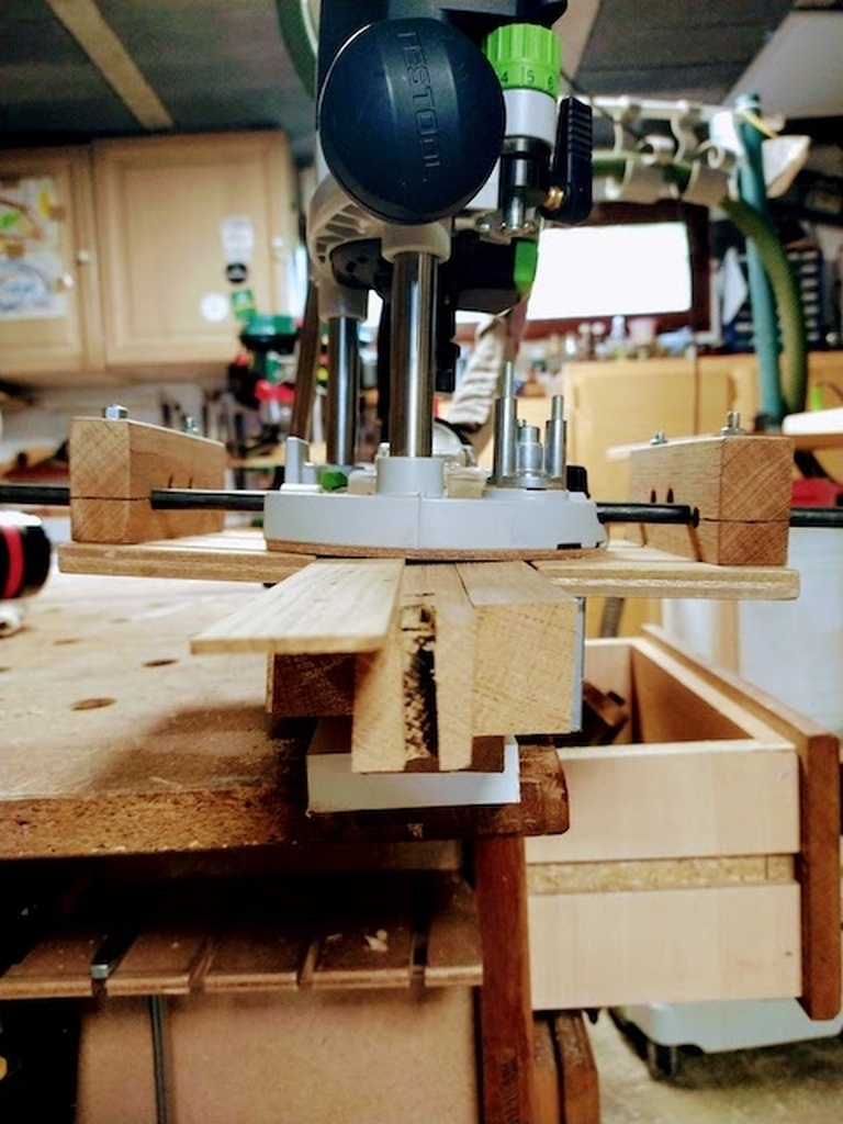 Faute de toupie, j’ai décidé de faire mes queues droites à la défonceuse et au GMA. Pour reproduire la technique d’empilement de cales pour décaler les usinages, j’ai fraisé une rainure dans une chute, dont je me suis servi pour vérifier l’épaisseur de mon morceau de hêtre qui allait me servir cales. Ma fraise ayant été réaffutée, je savais qu’elle ne faisait plus 8mm.