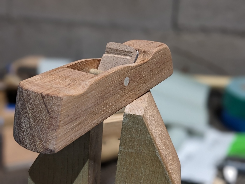 J'aime bien, lorsque je travaille un chant, mettre l'index gauche sous la semelle pour sentir la pièce et guider le rabot. J'ai donc creusé un emplacement pour le pouce sur le nez du rabot.