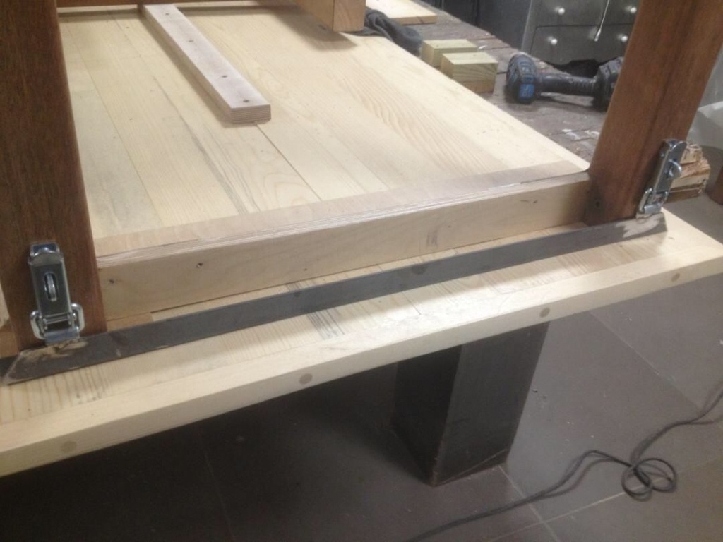 On pose de solides charnières, une cornière en métal de part et d'autre de la table (qui sert de butée) et des grenouillères pour permettre le clipsage.
