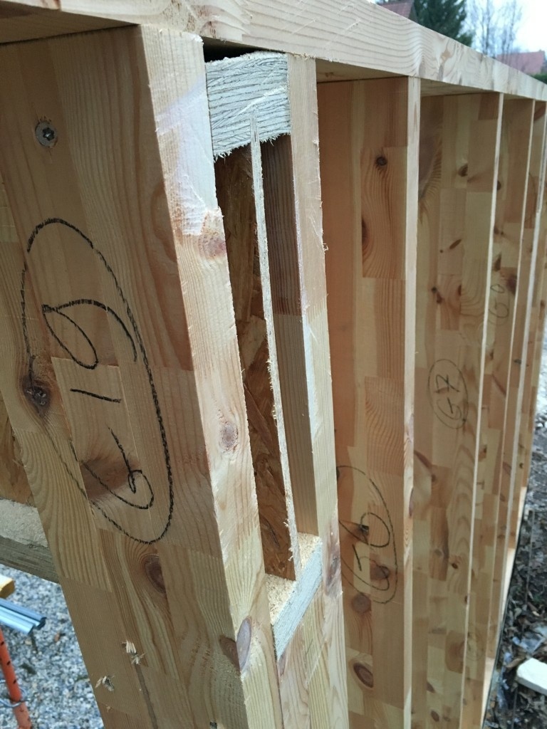 Quoiqu'il en soit, les coupes d'angles se sont parfaitement alignées et l'assemblage des deux parties du mur du fond s'est faite sans problèmes : j'étais le premier surpris. Je m'attendais à devoir faire plein d'ajustements mais finalement les mois de préparation, de modélisation et d'échanges ont portés leurs fruits : merci à tous ceux qui ont mis leur grain de sel.
