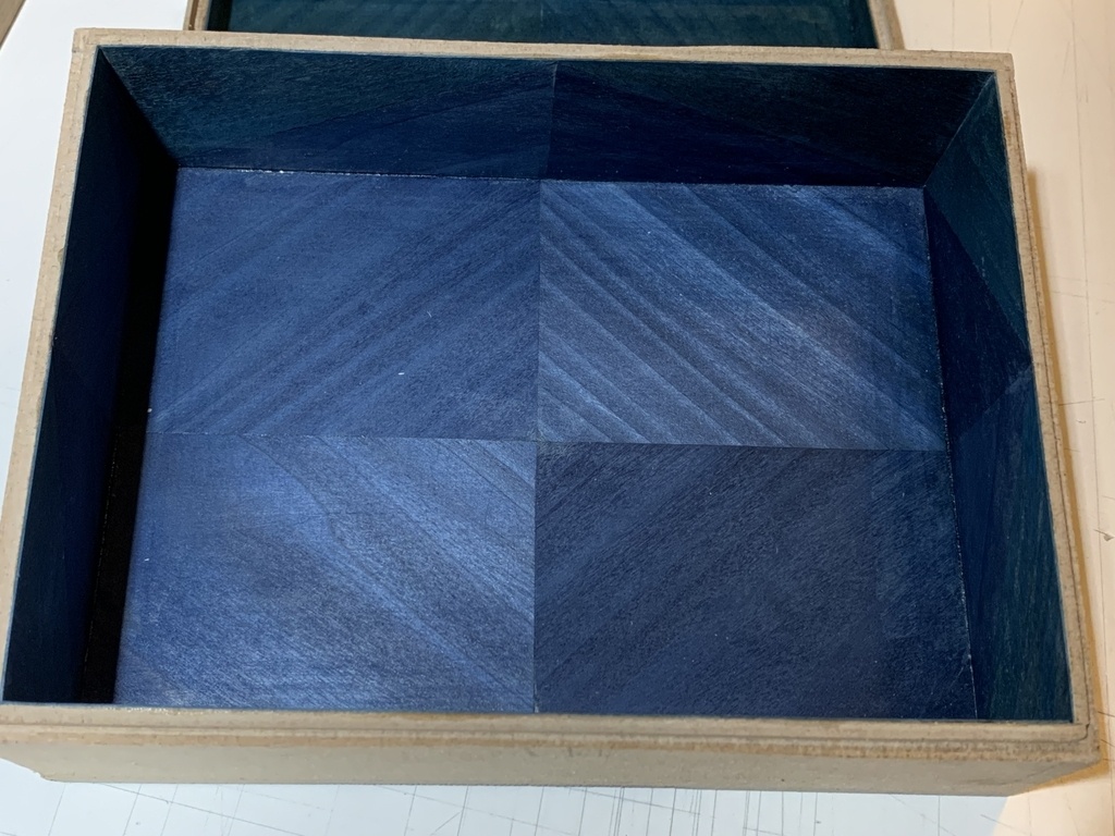 une boite. simple au premier abord. en medium de 6mm. bleu. avec du placage. peu importe l'essence mais bleu.