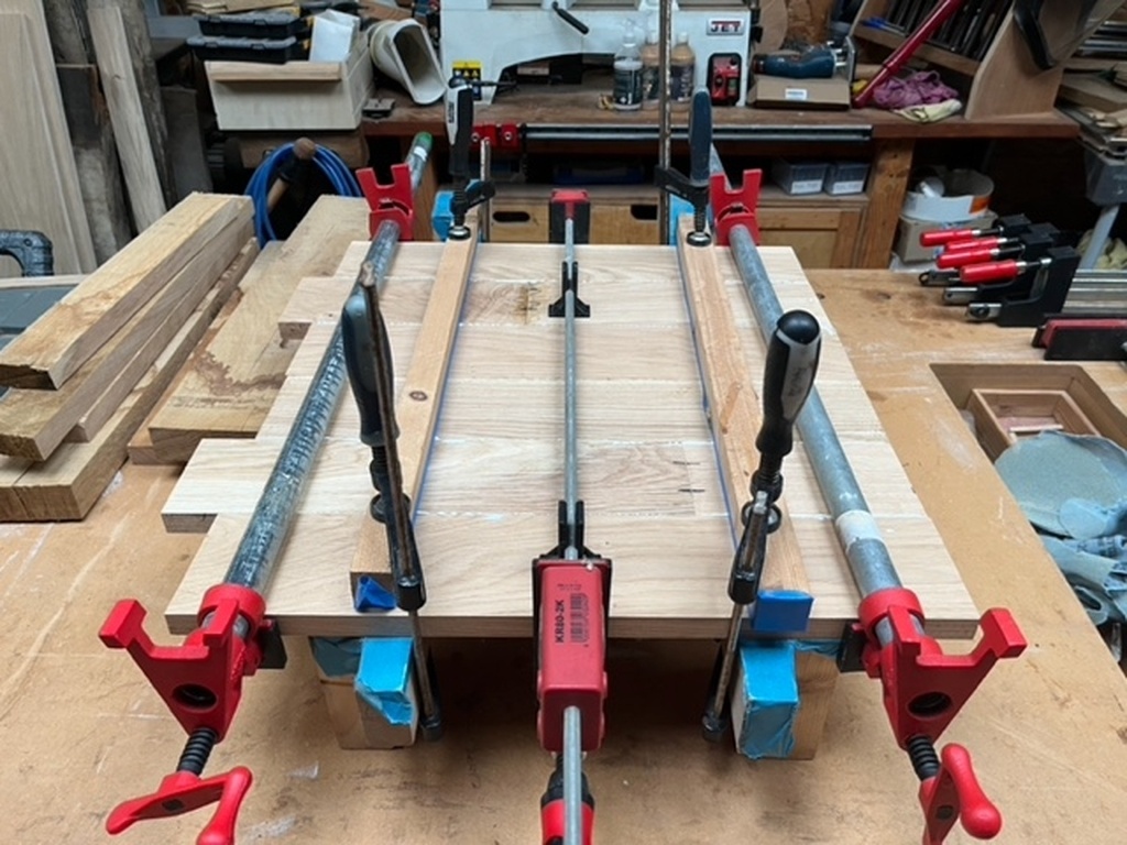 Il s'agit cette fois de coller trois plateaux de chêne de 38 MM pour les trois parties de cette bibliothèque.